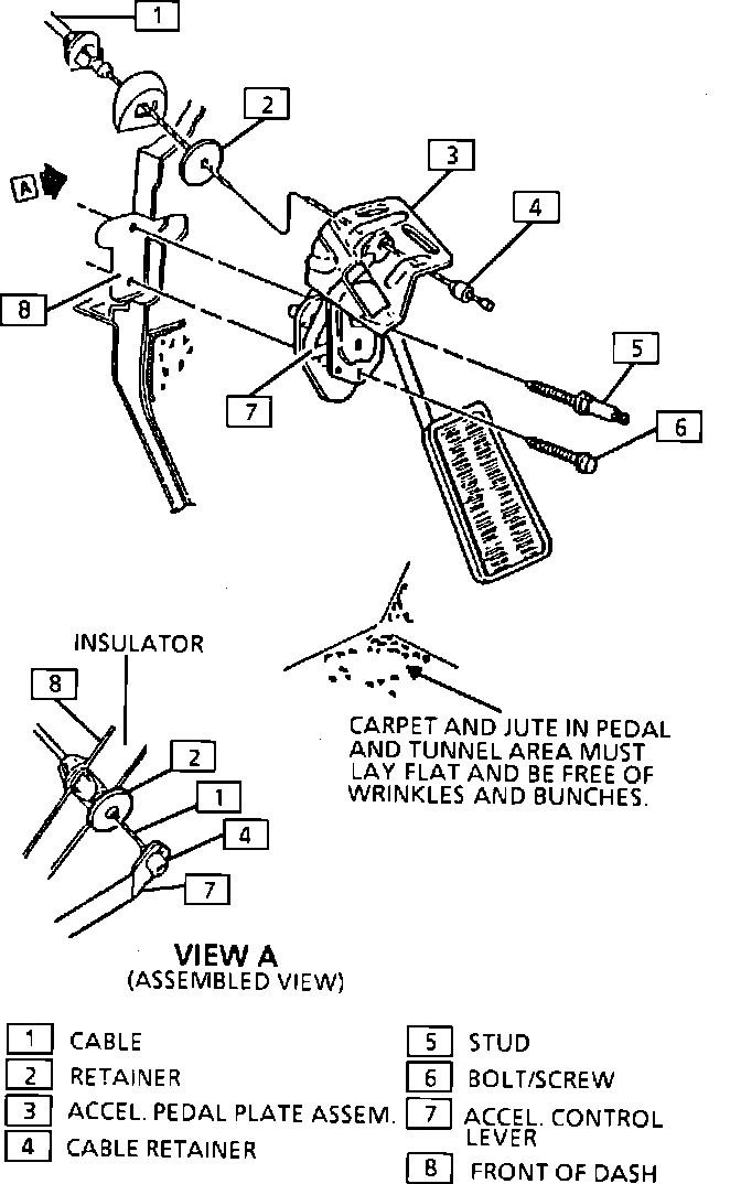^ The braided portion of the accelerator cable assembly must not come in contact with the front of the dash sealer during assembly, repair, or replacement of the assembly.