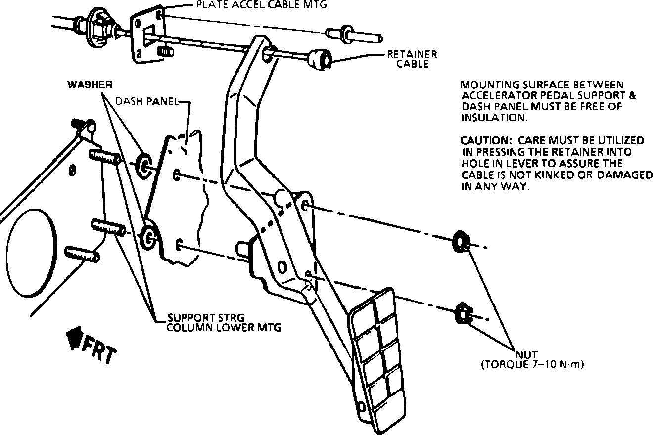 ^ The braided portion of the accelerator cable assembly must not come in contact with the front of the dash sealer during assembly, repair, or replacement of the assembly.