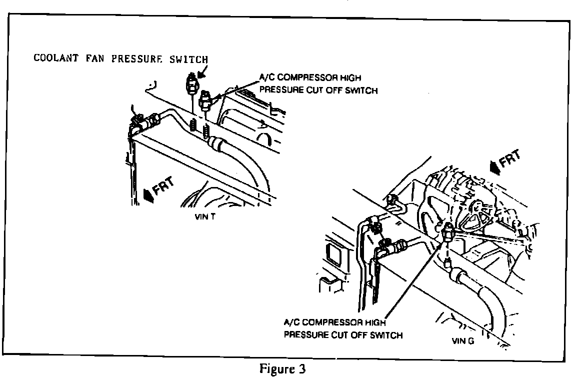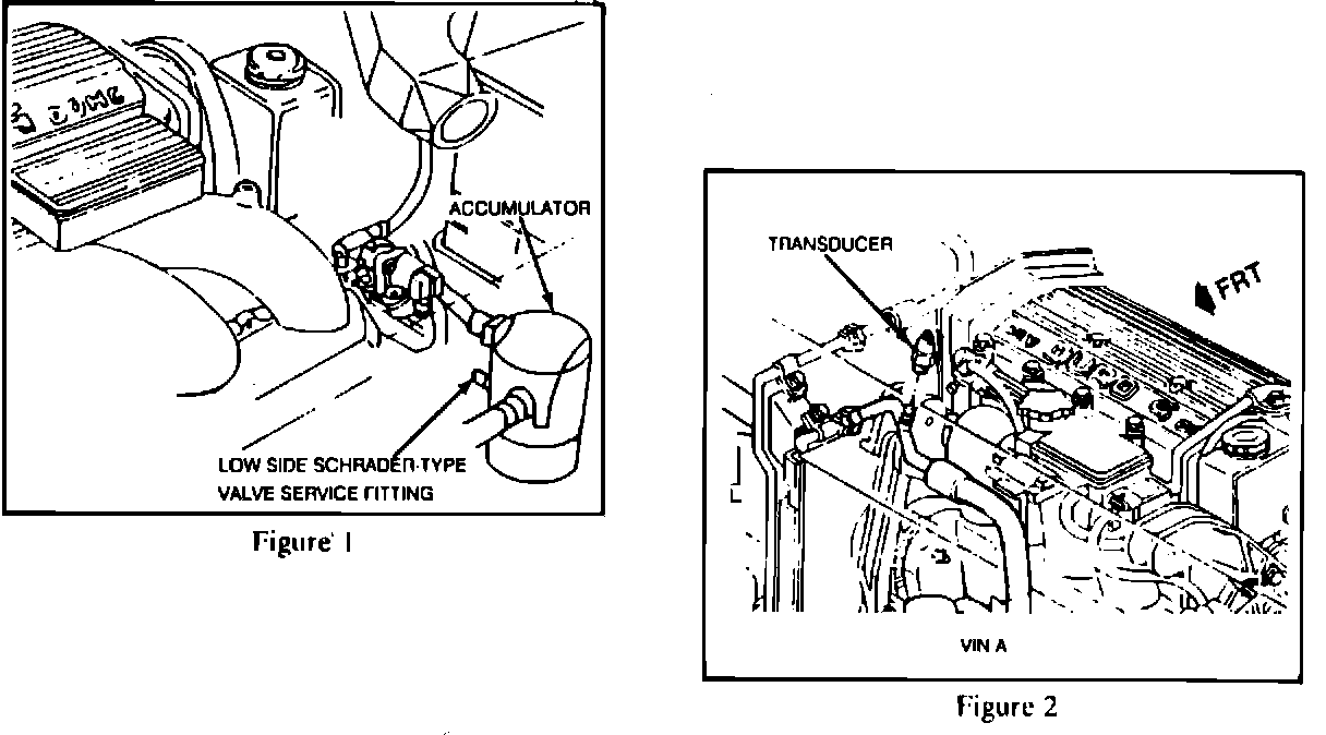 The A/C system does not have a high side schrader-type valve service fitting. All A/C refrigerant recovery, evacuation and charging procedures must be performed using low side schrader-type valve service fitting located on the accumulator as shown in Figure 1. A/C high side pressure may be read using a Tech-1 (or equivalent) diagnostic tool. The transducer, shown in Figure 2, must be properly installed for proper A/C system operation. Proper transducer torque value is 4.8 N-m (42 lb.in.)