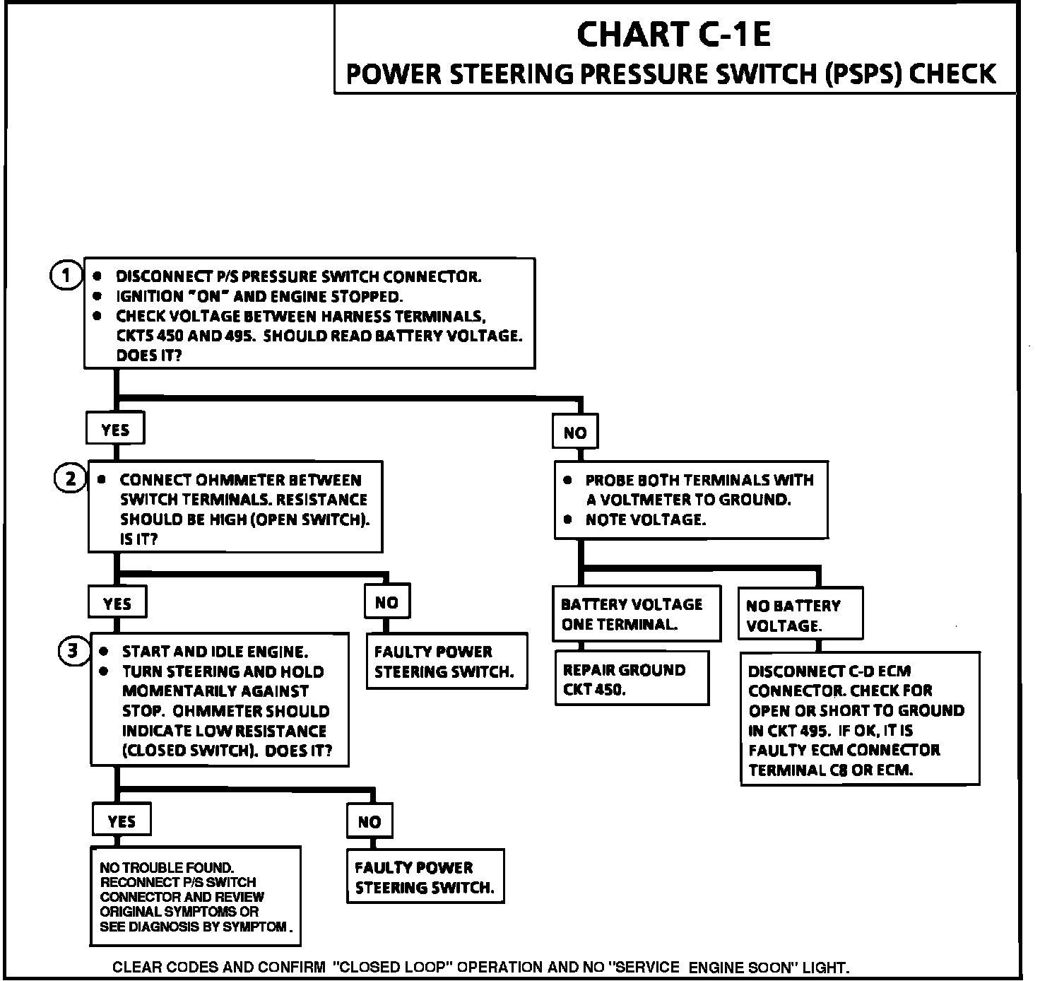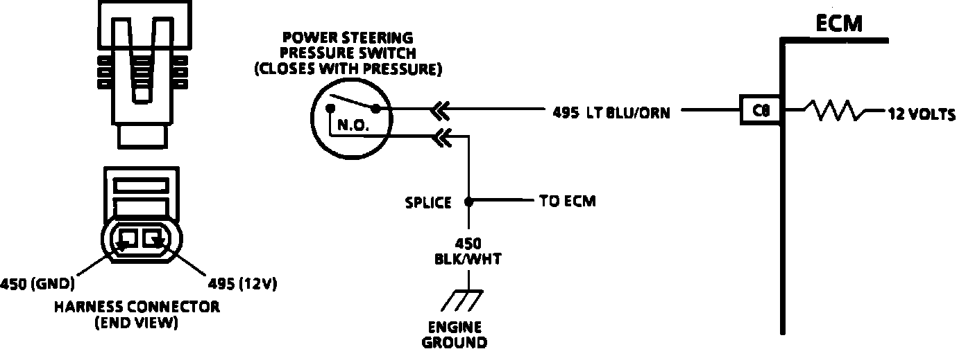 A pressure switch that will not close, or an open circuit in 495 or 450, may cause the engine to stall at idle when power steering loads are high. A switch that will not open or circuit 495 shorted to ground, may affect idle quality and will cause timing to retard at idle.