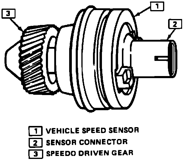 The Vehicle Speed Sensor (VSS) is made up of a coil, which is mounted on the transmission, and a tooth rotor which is mounted to the output shaft in the transmission. As each rotor tooth nears the coil, the coil produces an Alternating Current (AC) voltage pulse. As the vehicle speed increases, the number of AC voltage pulses increase. The Digital Ratio Adapter Controller (DRAC) processes input from the VSS sensor and output signals from the speedometer, computer, and cruise control module. The DRAC takes the voltage pulses from the VSS sensor and uses them to open and close four solid state output switches to ground at a rate proportional to vehicle speed. The DRAC is matched to the vehicle based on final drive ratio and tire size. It is important to make sure the correct DRAC module is replaced on the vehicle if replacement is necessary.