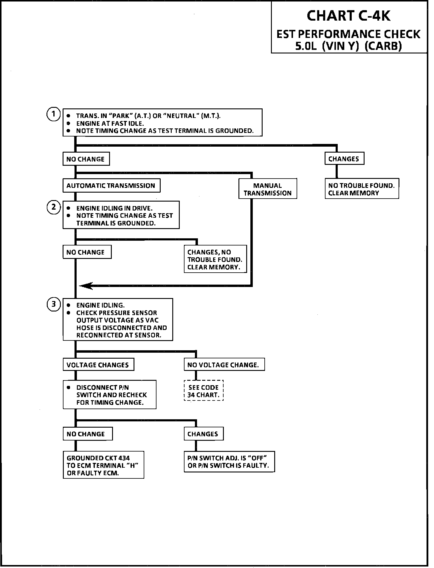 1. Grounding "test" terminal causes the system to go to a fixed spark advance which should be different from that obtained with EST operating. Engine is run at fast idle to get more spark advance. Usually the change is enough so it can be heard in rpm change. If so, it is not necessary to check timing.