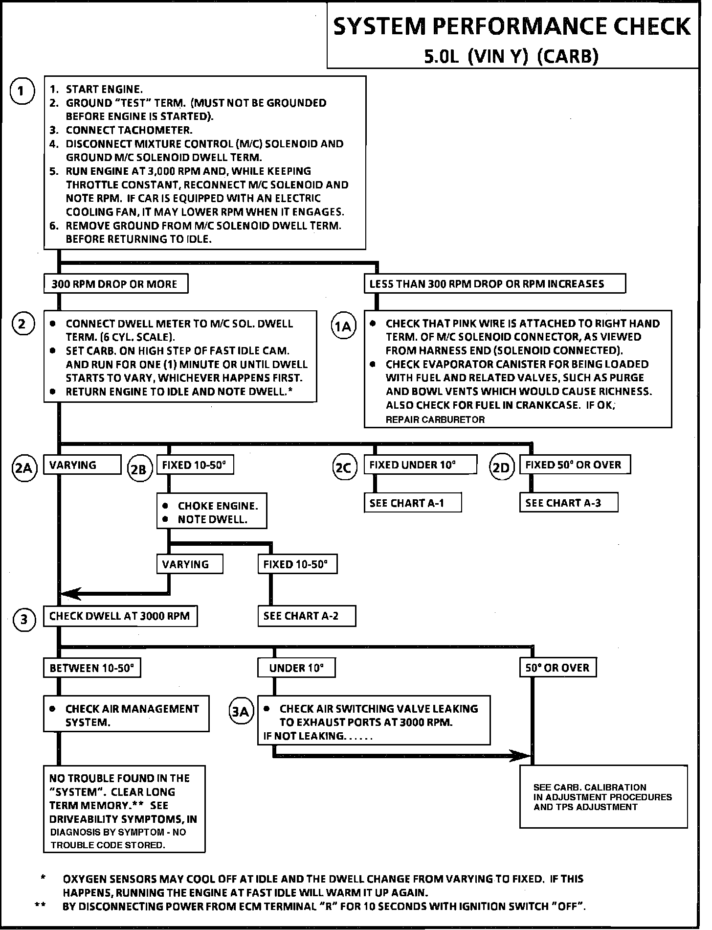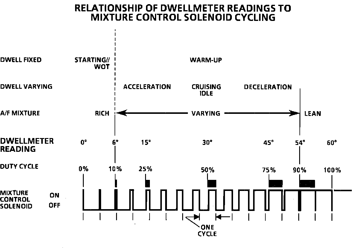 1. Checks for the ability of the carburetor main metering system to change the air/fuel mixture. Disconnecting the M/C solenoid makes the carburetor operate full-rich (O% duty cycle) and reconnecting it with the dwell lead grounded makes it operate full-lean (100% duty cycle). Normal response is for rpm to drop, as M/C solenoid is reconnected. Normal drop should be within a 300 to 1000 rpm range.