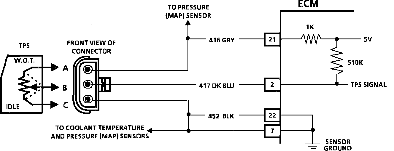 6. The 510K ohm pull-up resistor inside the ECM should cause CKT 417 (terminal "B") to have 5 volts if the TPS is disconnected, unless CKT 417 is shorted to ground, or the ECM is faulty. If the ECM is putting 5 volts on CKT 417 (terminal "B"), but does not indicate an over 4.50 volt TPS signal on the "Scan" tool, the ECM is faulty.