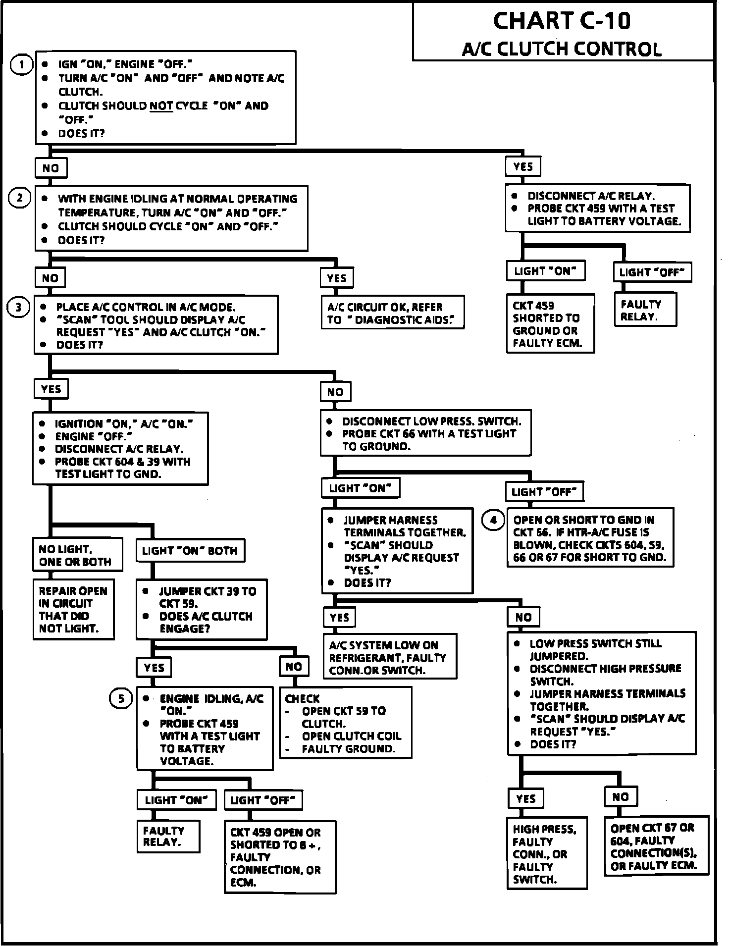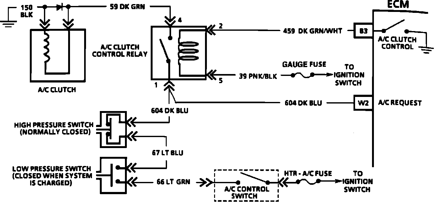 4. A short to ground in any part of the A/C request, circuit 604, circuit 59 to the A/C clutch, or clutch control circuit may be the cause of a blown fuse.