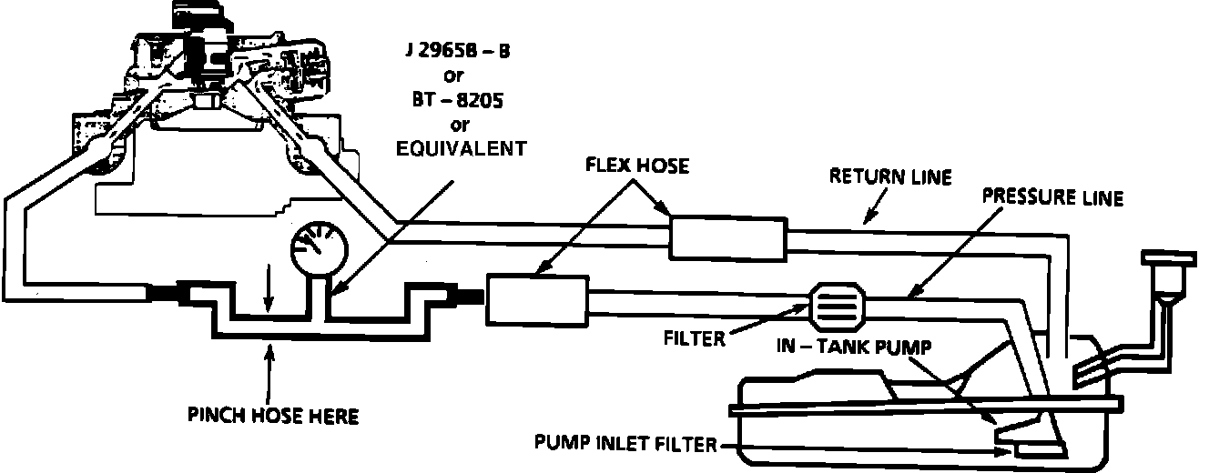 5. Connect fuel pressure gage, J-29658-B, in between the fuel feed line and the TBI unit. Use the appropriate adapters.