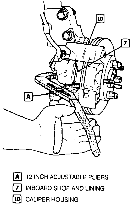 2. Remove shoe and lining assemblies from caliper. To remove outboard shoe and lining use 12-inch adjustable pliers to straighten bent over shoe tabs.