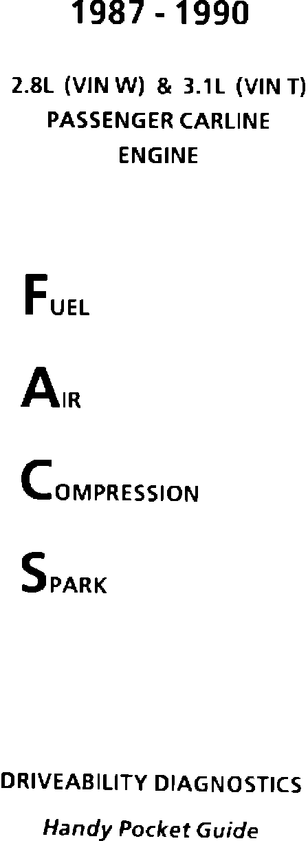 General Motors has released many service bulletins and calibration MEM-CALS to correct driveability concerns during the 1987 through 1990 model years for the 2-8/3.1 liter applications. This handy pocket guide will allow the technician to easily select the proper bulletin and MEM-CAL using the customer complaint as the reference for determining the correct diagnostic procedure. This guide contains our latest driveability MEM-CALS and bulletin updates. All previous 2.8/3.1 liter driveability complaint bulletins should not be used. It is important to remember that the 2.8/3.1 liter engine uses "Closed Loop" fuel and spark control technology. For this reason, it is very important that all of the engine components and the base engine assembly are in proper working order. The Electronic Control Module (ECM) uses the inputs from its sensors as the basis for calculating fuel and spark. A component that is not functioning properly will cause false values to be used in the closed loop fuel and spark calculations resulting in a possible driveability complaint by the customer. This guide is not intended to take the place of the Service Manual for diagnosis, but to assist the technician as a quick reference to bulletins, MEM-CALS and correct engine parameters when using a TECH 1 scan tool.