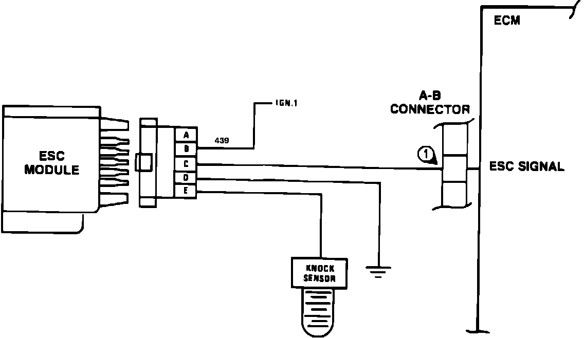 Electronic Spark Control (ESC) is accomplished with a ESC module that sends a voltage signal to the ECM. As the knock sensor detects engine knock, the voltage from the ESC module to the ECM is reduced. This signals the ECM to retard the timing, if engine speed is over approximately 900 rpm.