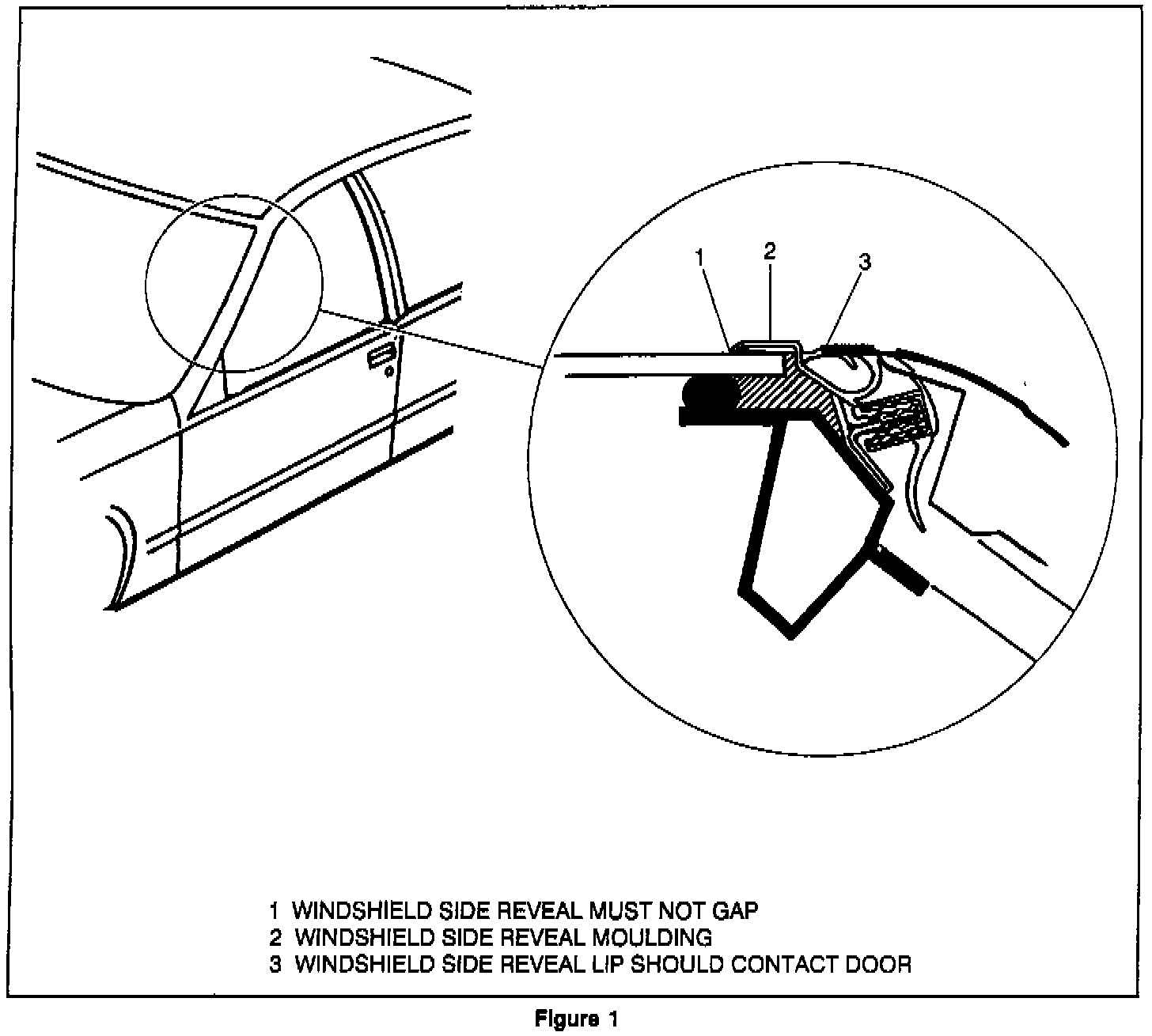 Adjust the door inboard so there is slight contact of the door frame along the A-pillar to the windshield side reveal molding (See Figure 1).