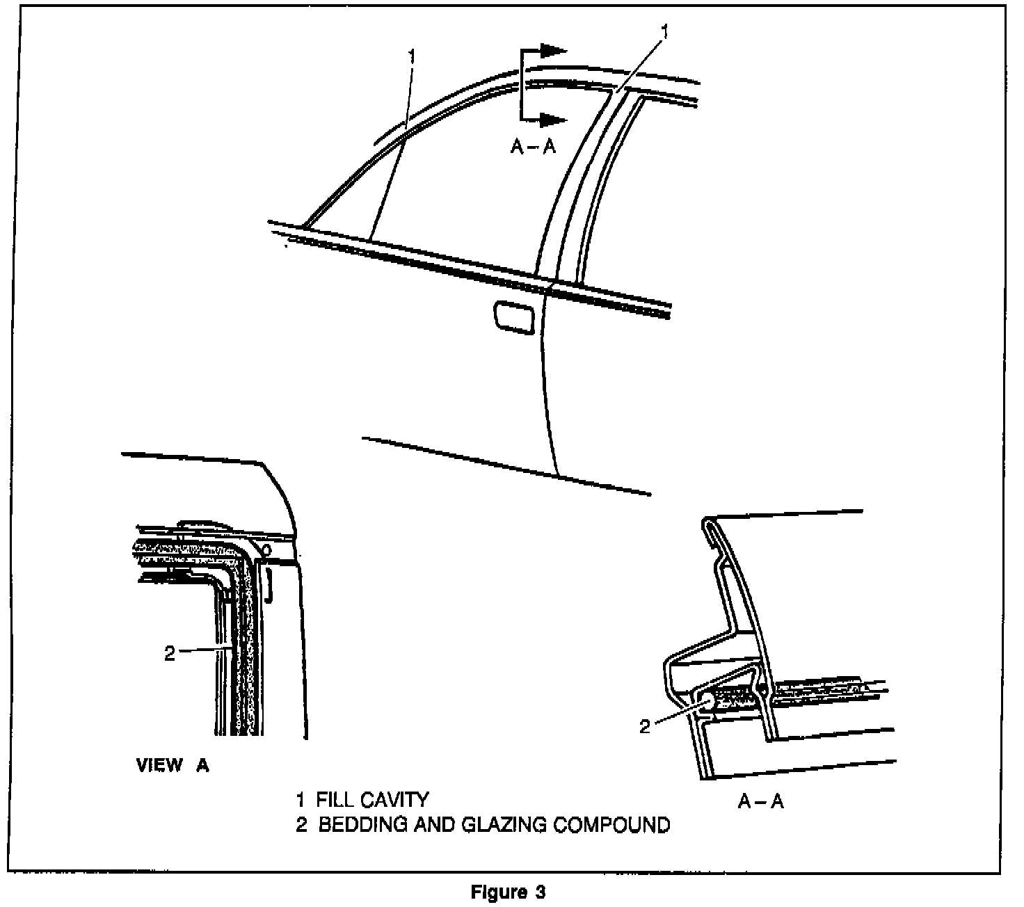 5. Using bedding and glazing compound, fill the cavity in the upper rear corner of the door frame (See Figure 3, View A). Also fill the cavity in the upper corner above the mirror where the run channel retainers meets the mirror.
