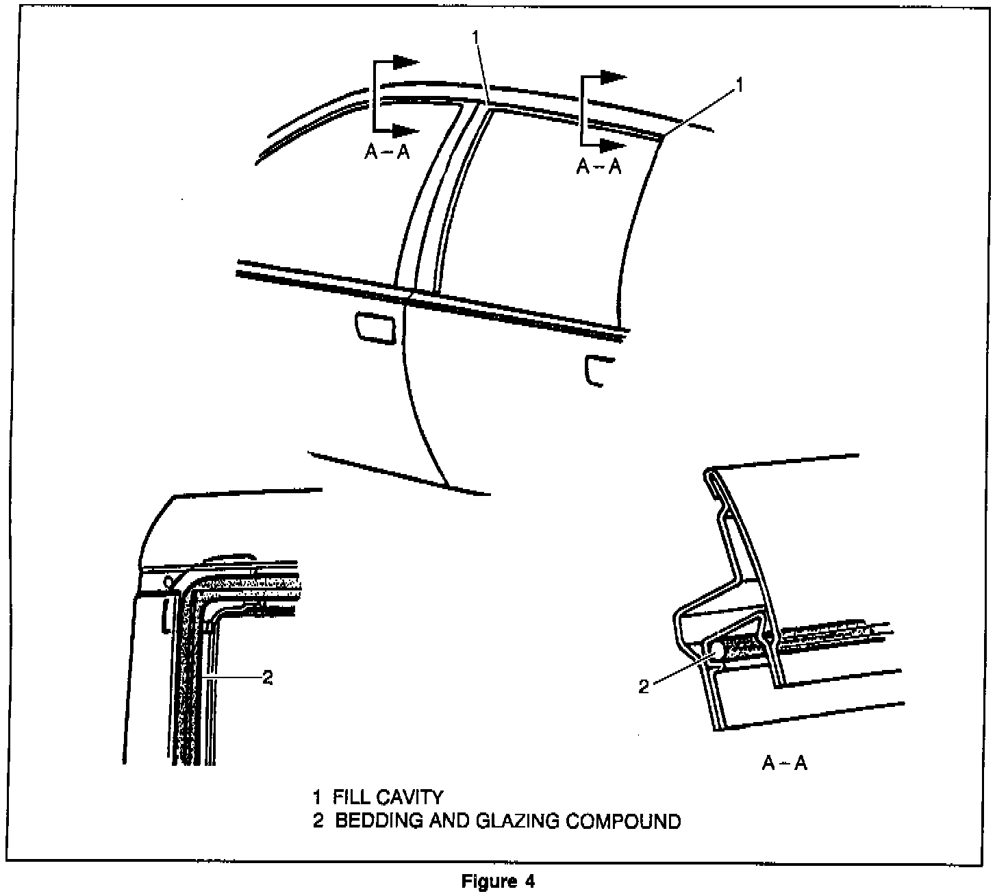 4. Using bedding and glazing compound, run a 5 mm bead around entire inboard edge of the retainer (See Figure 4, View B). Using bedding and glazing compound, fill the cavity in the upper front corner of the rear door and the upper rear corner of the door.