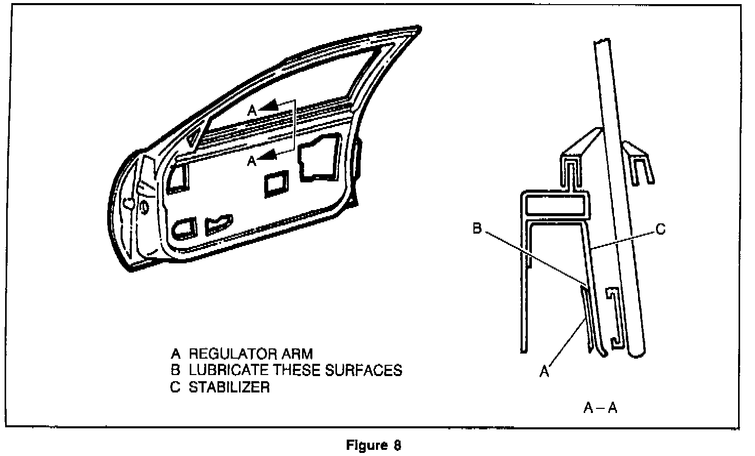 2. After necessary adjustment has been completed, lightly coat the outboard surface of the regulator arm and the inboard surface of the stabilizer arm where they come in contact with lubriplate or equivalent.