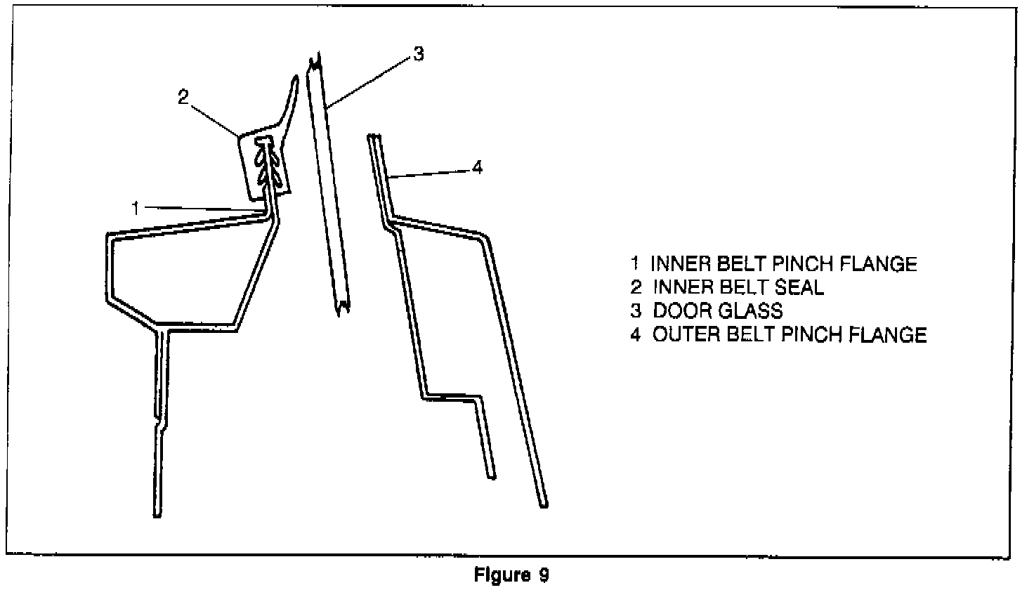 After inner belt strip is removed, bend the inner belt pinch flange outboard so the inner belt seal touches glass (See Figure 9).