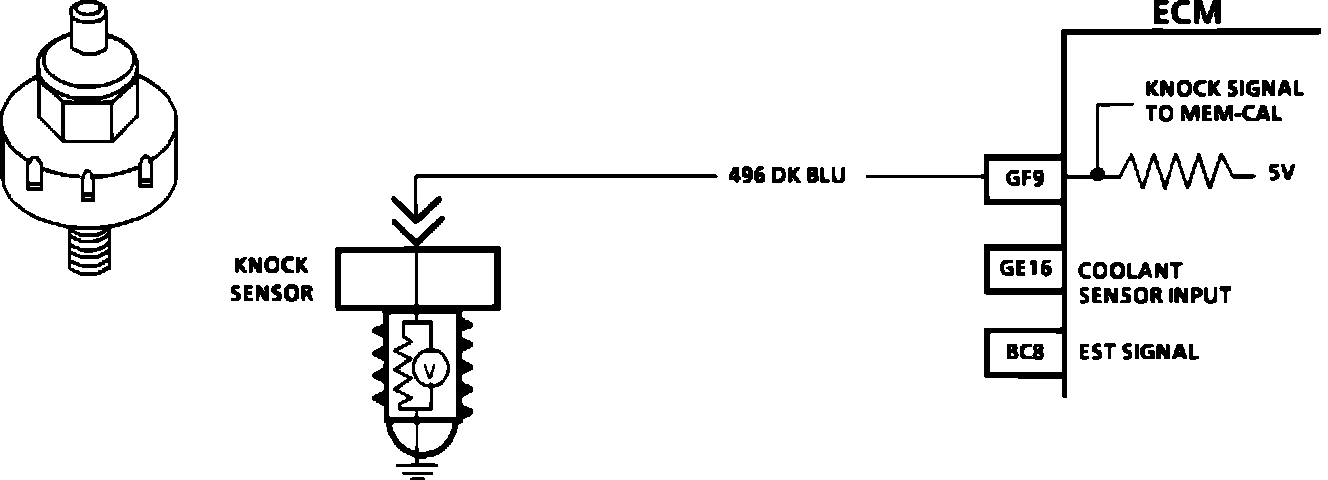 The knock sensor is used to detect engine detonation and the ECM will retard the electronic spark timing based on the signal being received. The circuitry, within the knock sensor, causes the ECM's 5.0 volts to be pulled down so that under a no knock condition, CKT 496 would measure about 2.5 volts. The knock sensor produces an AC signal, which rides on the 2.5 volts DC voltage. The amplitude and frequency are dependent upon the knock level.
