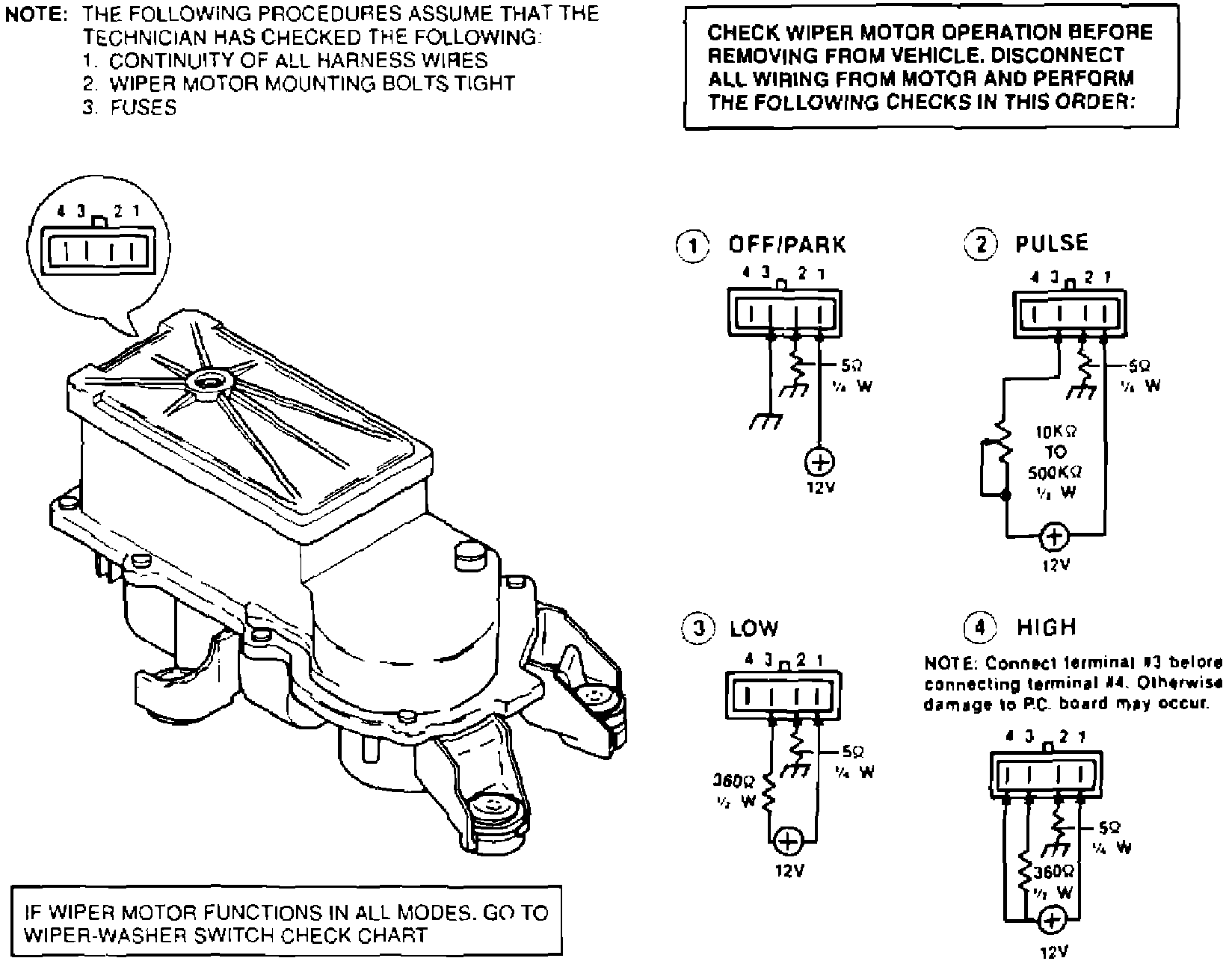 Check for motor operation before removing from vehicle. Disconnect all wiring from wiper and perform the 5 mode checks (6 with pulse) in the image.