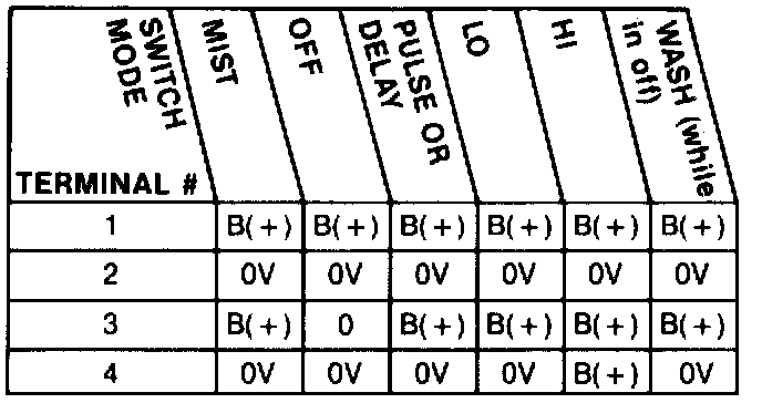 Disconnect wiring harnesses from wiper motor and perform the following multi-function lever tests using a digital voltmeter with ignition switch on. All voltage readings taken with respect to vehicle ground. Probe terminals 1 through 4 with digital voltmeter and multi-function lever in various positions.