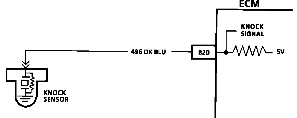 The knock sensor is used to detect engine detonation and the ECM will retard the electronic spark timing based on the signal being received. The circuitry, within the knock sensor, causes the ECM's 5.0 volts to be pulled down so that under a no knock condition, CKT 496 would measure about 2.5 volts. The knock sensor produces an AC signal. The AC voltage is then sent to the ECM which reduces the ECM signal voltage. The reduction of the ECM signal voltage triggers the ECM to retard timing. The amount of AC signal is determined by the amount of knock.