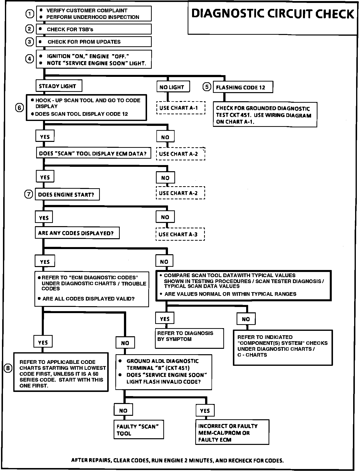 4. Bulb Check - to check SES light circuit and that the computer can complete the circuit. The system check starts with a bulb check. If there is no "SERVICE ENGINE SOON" light, refer to CHART A-1.
