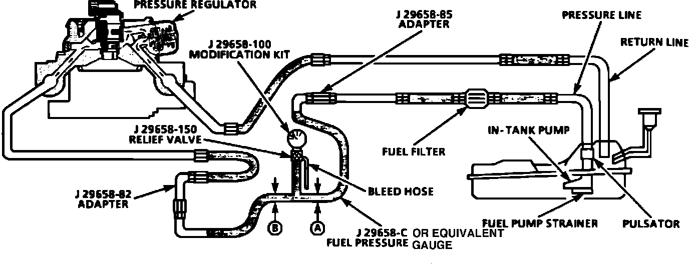 5. Connect fuel pressure gage, J-29658-B, in between the fuel feed line and the TBI unit. Use the appropriate adapters.