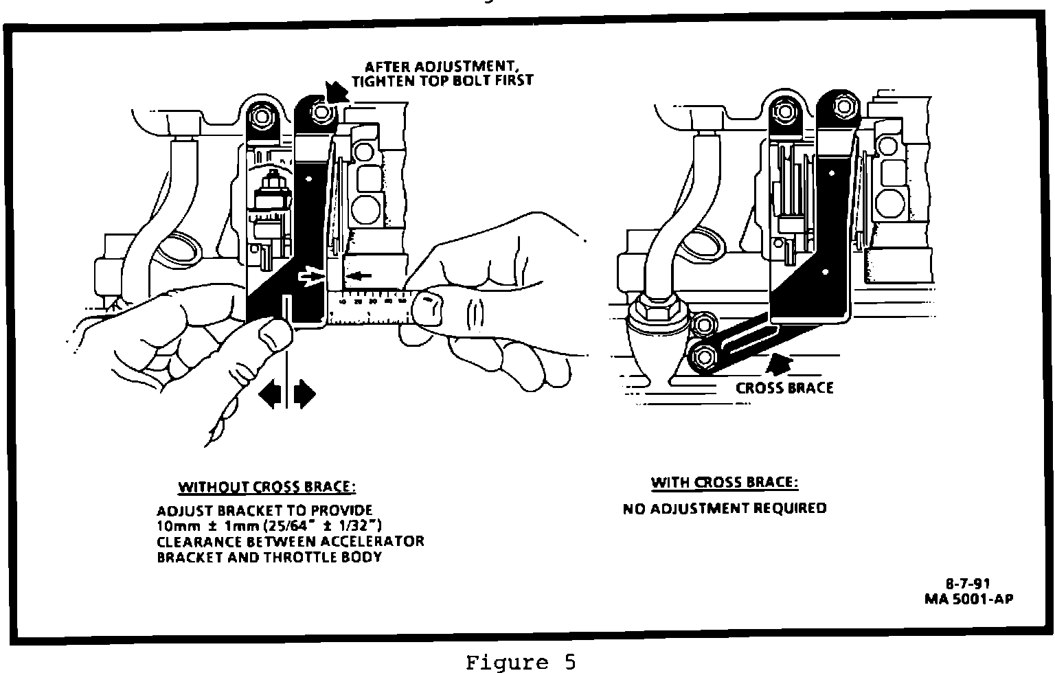 B. Adjust accelerator bracket to obtain a 10 mm +/- 1 mm (25/64 +/- 1/32) gap between bracket and throttle body (See Figure 5).