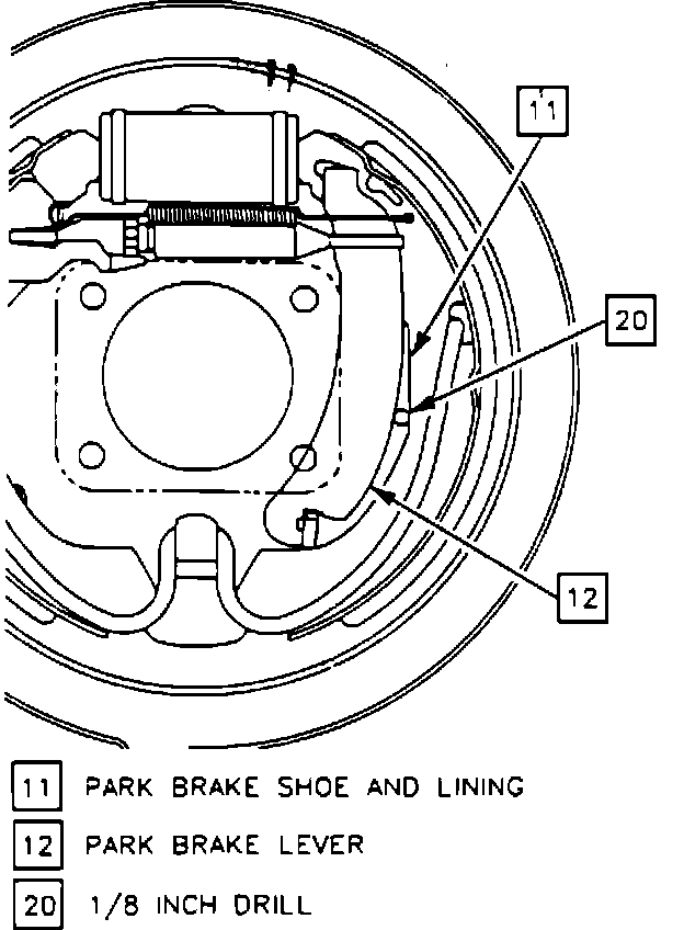 6. Adjust cable until and 1/8 inch drill bit can be inserted through access hole into space between shoe web and park lever, Fig. 4. Proper adjustment is when a 1/8 inch drill bit will fit in the space and a 1/4 inch drill bit will not fit.