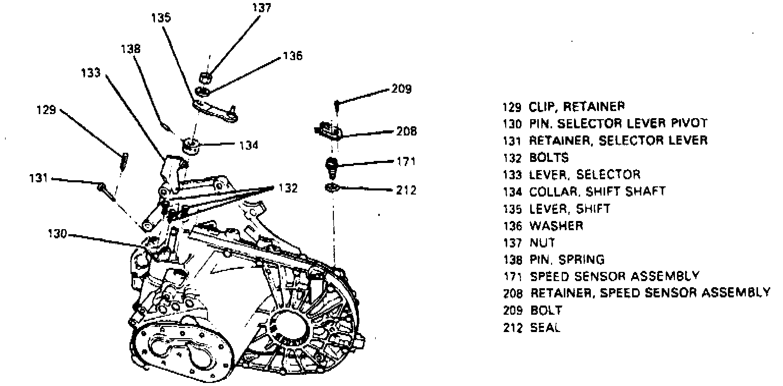 c. Remove pin (138) and shift shaft collar (134), then the bolts (132) and selector lever retainer (131).