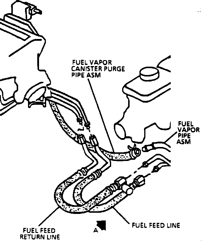 1. Engine compartment connecting fuel feed and return hose assemblies to chassis fuel feed and return pipes.