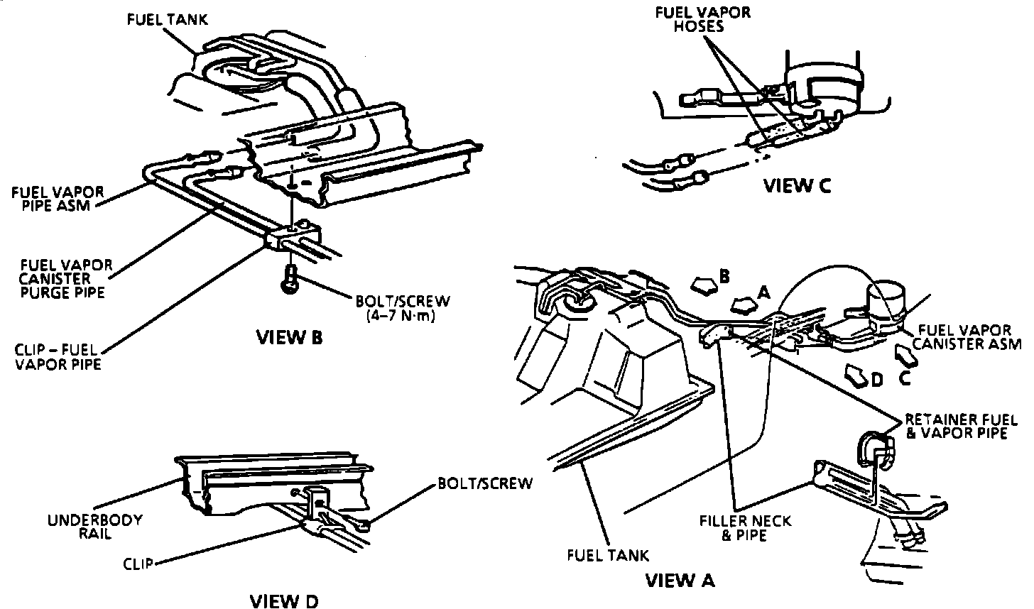 3. Vapor pipe and fuel feed and return pipes on under body with body clips (4) and attaching screws (4).