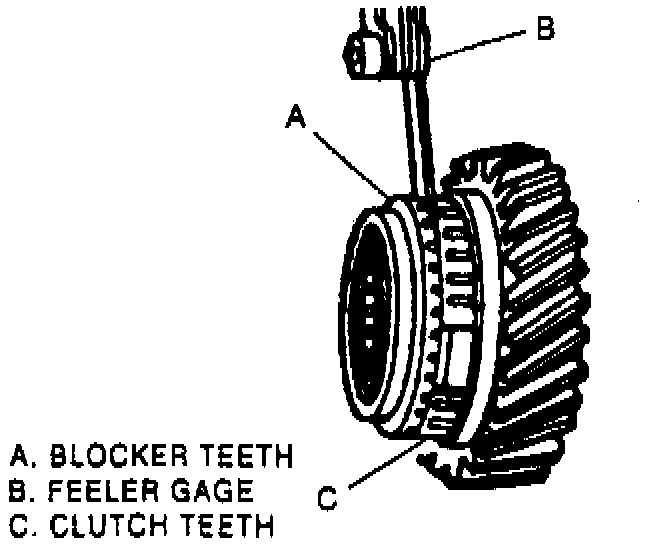 3. Measure gap between vertical faces of blocker teeth and clutch teeth. Nominal gap is 0.035-0.059 inch for new blocker rings.