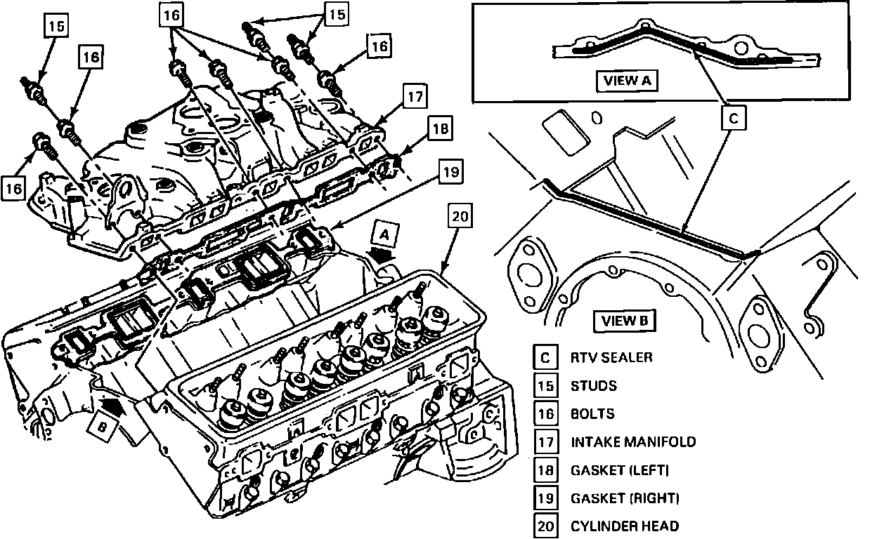 1. Gaskets to cylinder heads. Apply a 5 mm (3/16-inch) bead of RTV sealer, GM P/N 1052914 or equivalent, on the front and rear ridges of the cylinder case. Extend the RTV bead 13 mm (1/2-inch) up each cylinder head to seal and retain the intake manifold side gaskets.