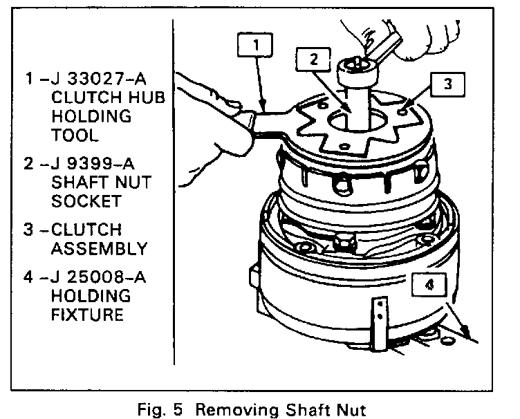 2. Keep the clutch hub from turning with the Clutch Hub Holding Tool J 33027-A, remove the shaft nut, using Thin Wall Socket J 9399 (Fig. 5).