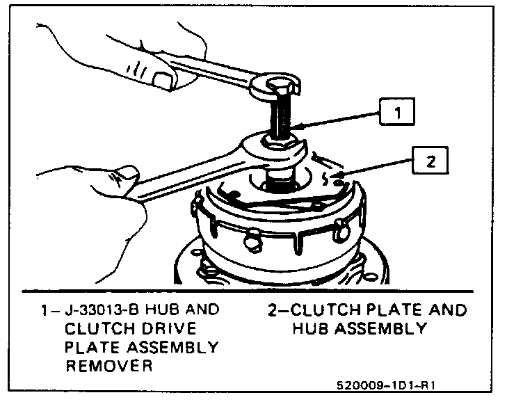 3. Thread the Clutch Plate and Hub Assembly Remover J 33013-B, into the hub. Hold the body of the Remover with a wrench and turn the center screw into the Remover body to remove the Clutch Plate and Hub assembly (Fig. 6).