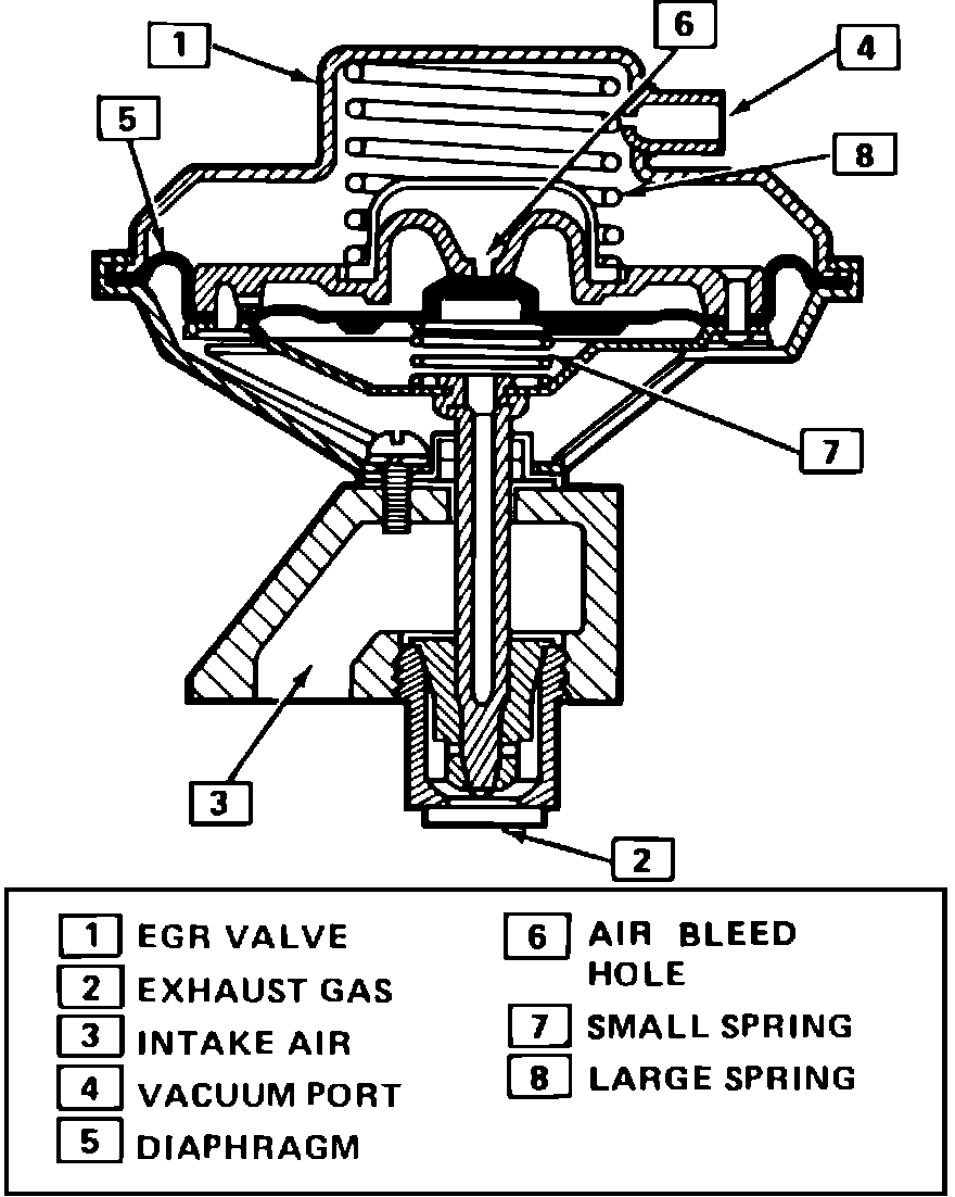 The EGR system routes exhaust gases from the exhaust manifold to the intake manifold at specified engine operating conditions. This EGR valve is called a negative backpressure valve. It varies the amount of exhaust gases flowing into the intake manifold depending upon the manifold vacuum, and variations in exhaust backpressure. The amount of vacuum to the EGR valve is controlled by the ECM, which triggers a solenoid. The exhaust gases combine with the air/fuel mixture into the combustion chamber. Since there is less air/fuel mixture to burn in the combustion chamber, during EGR operation, the temperature is reduced and NOx formation is limited. If too much exhaust gas enters, combustion will not occur. Because of this, very little exhaust gas is allowed to pass through the valve, especially at idle. The valve should only open when the engine is at operating temperature and above idle speed.