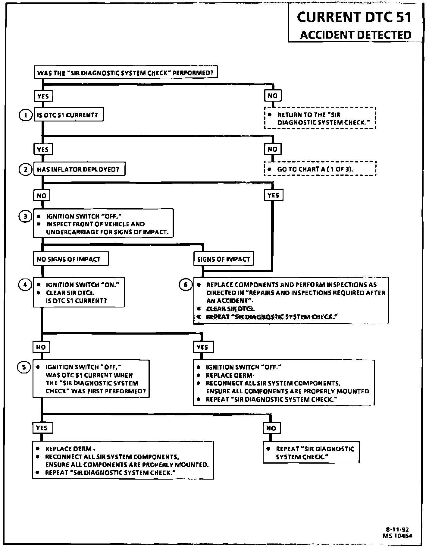 The following procedure (see illustration) is necessary after air bag deployment. DTC 51 (Accident Detected) will be set when a frontal crash with air bag deployment has occurred. After replacing SIR components DTC 51 will need to be cleared from the DERM. If DTC 51 is not cleared the SIR warning lamp will stay "ON."