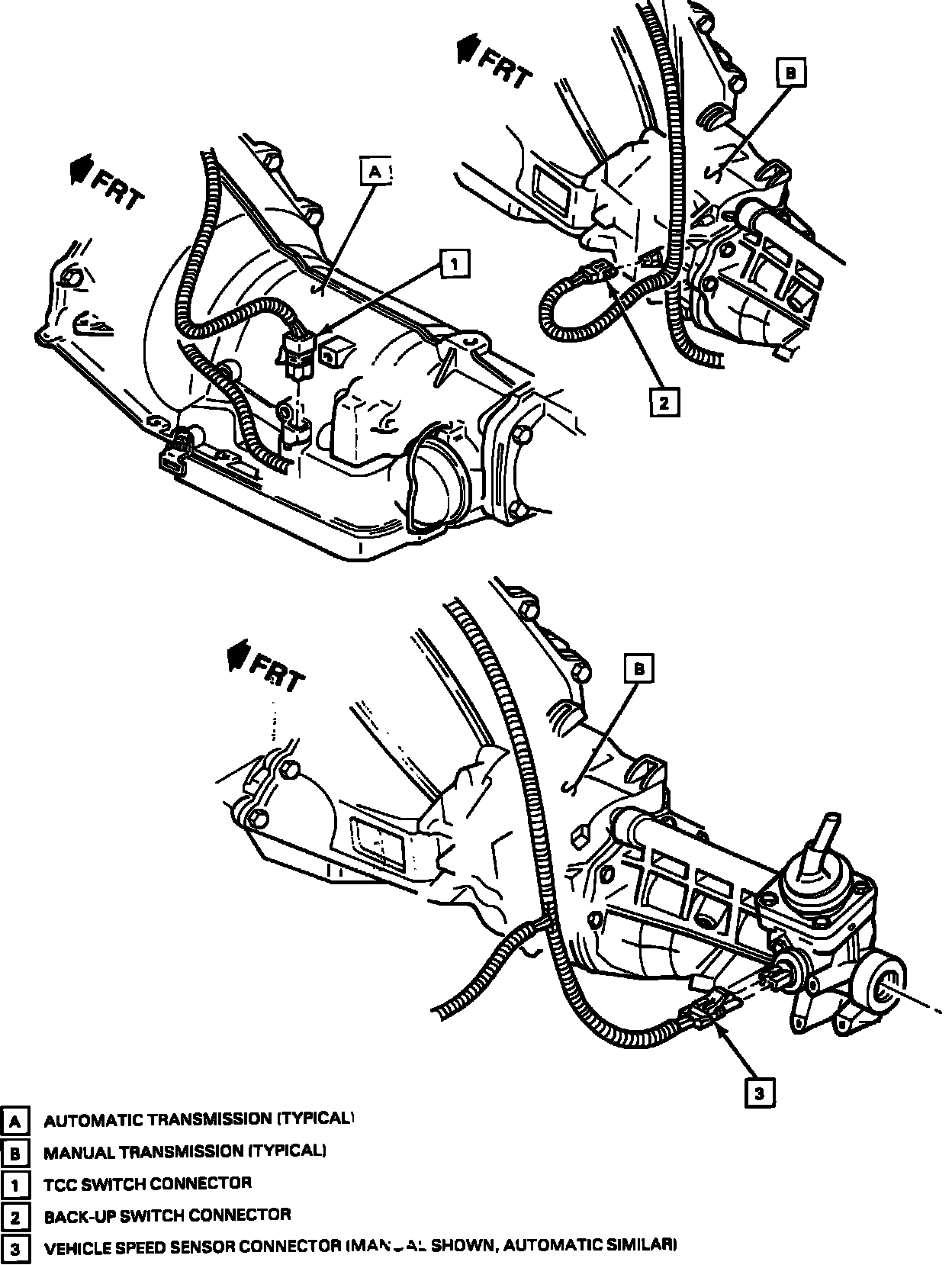 3 VEHICLE SPEED SENSOR CONNECTOR (MANUAL SHOWN, AUTOMATIC SIMILAR)
