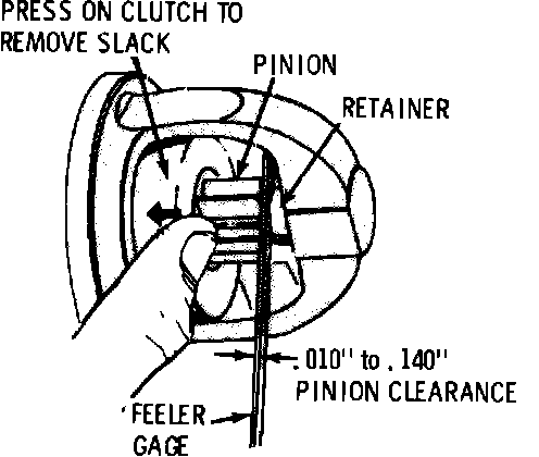 There is no provision for adjusting pinion clearance on this type motor. When the shift lever mechanism is correctly assembled, the pinion clearance should fall within the limits of .010 to .140 inch. When the clearance is not within these limits, it may indicate excessive wear of the solenoid linkage or shift lever yoke buttons.