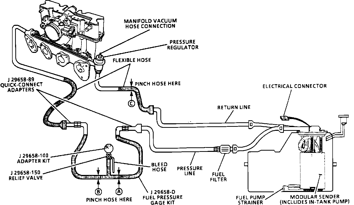 2. Restricting fuel flow at the fuel pressure gauge (at B) causes fuel pressure to build above regulated pressure. With battery voltage applied to the pump test terminal, pressure should rise above 325 kPa (47 psi) as the gauge outlet hose is restricted.