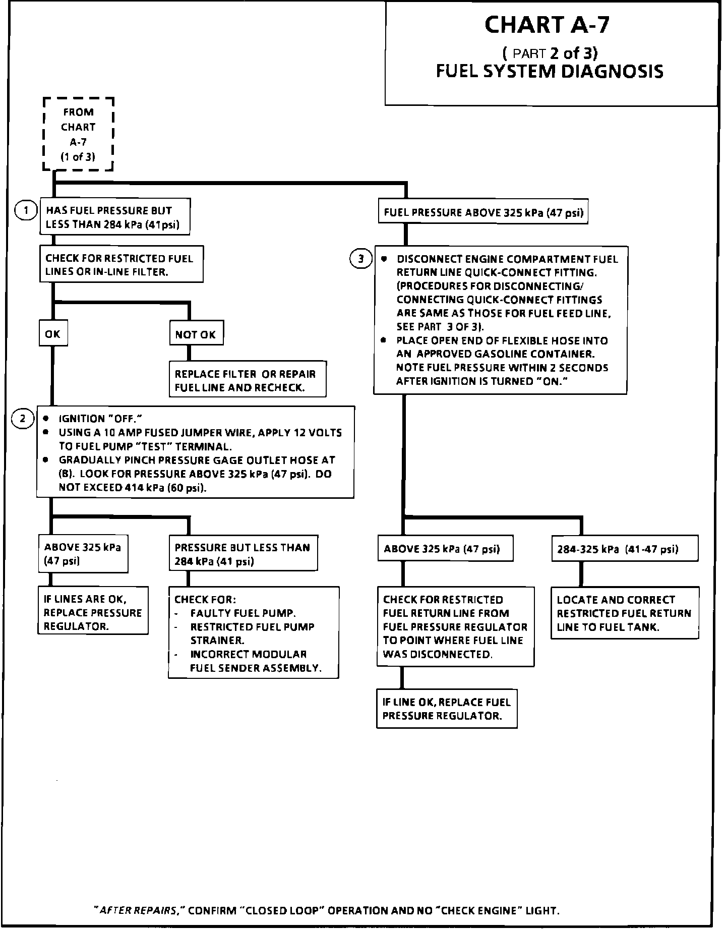 1. Pressure below 284 kPa (41 psi) may cause a lean condition and may set a Code 44 or Code 32. It could also cause hard starting cold and poor driveability. Low enough pressure will cause the engine not to run at all. Restricted flow may allow the engine to run at idle, or low speeds, but may cause a surge and stall when more fuel is required, as when accelerating or driving at high speeds.