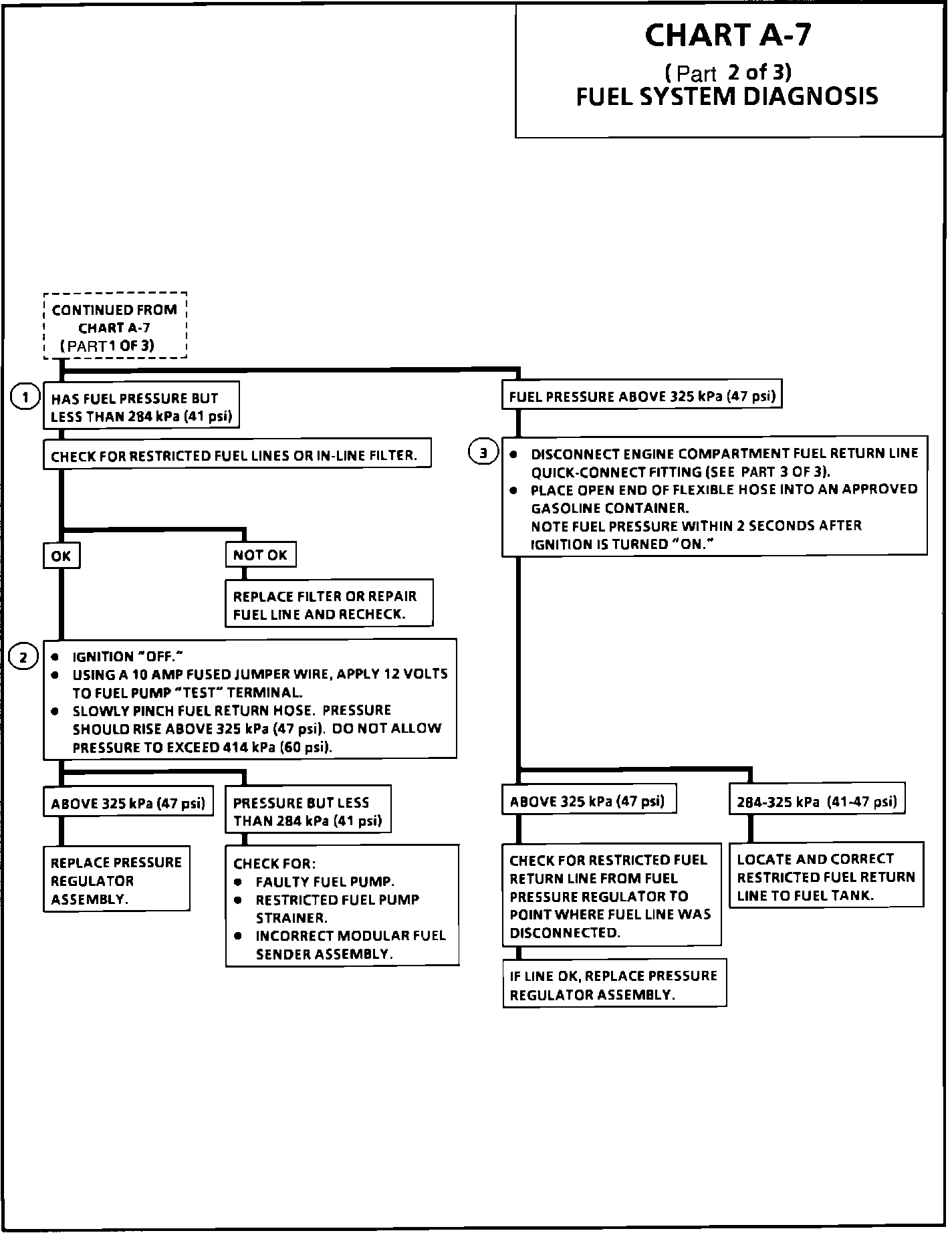 1. Pressure below 284 kPa (41 psi) may cause a lean condition and may set Code 44. It could also cause hard starting cold and poor driveability. Low enough pressure will cause the engine not to run at all. Restricted flow may allow the engine to run at idle, or low speeds, but may cause a surge and stall when more fuel is required, as when accelerating or driving at high speeds.