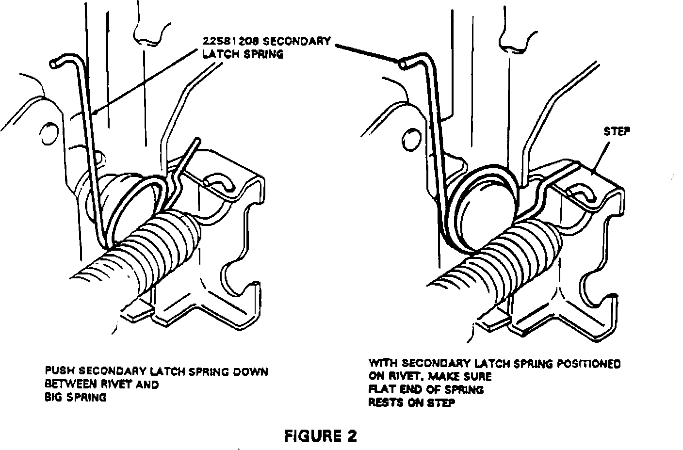4. Place the spring partially into position over large rivot that secondary latch pivots on. Make sure that flat end of spring is resting on horizontal spring stop. See Figure 2.