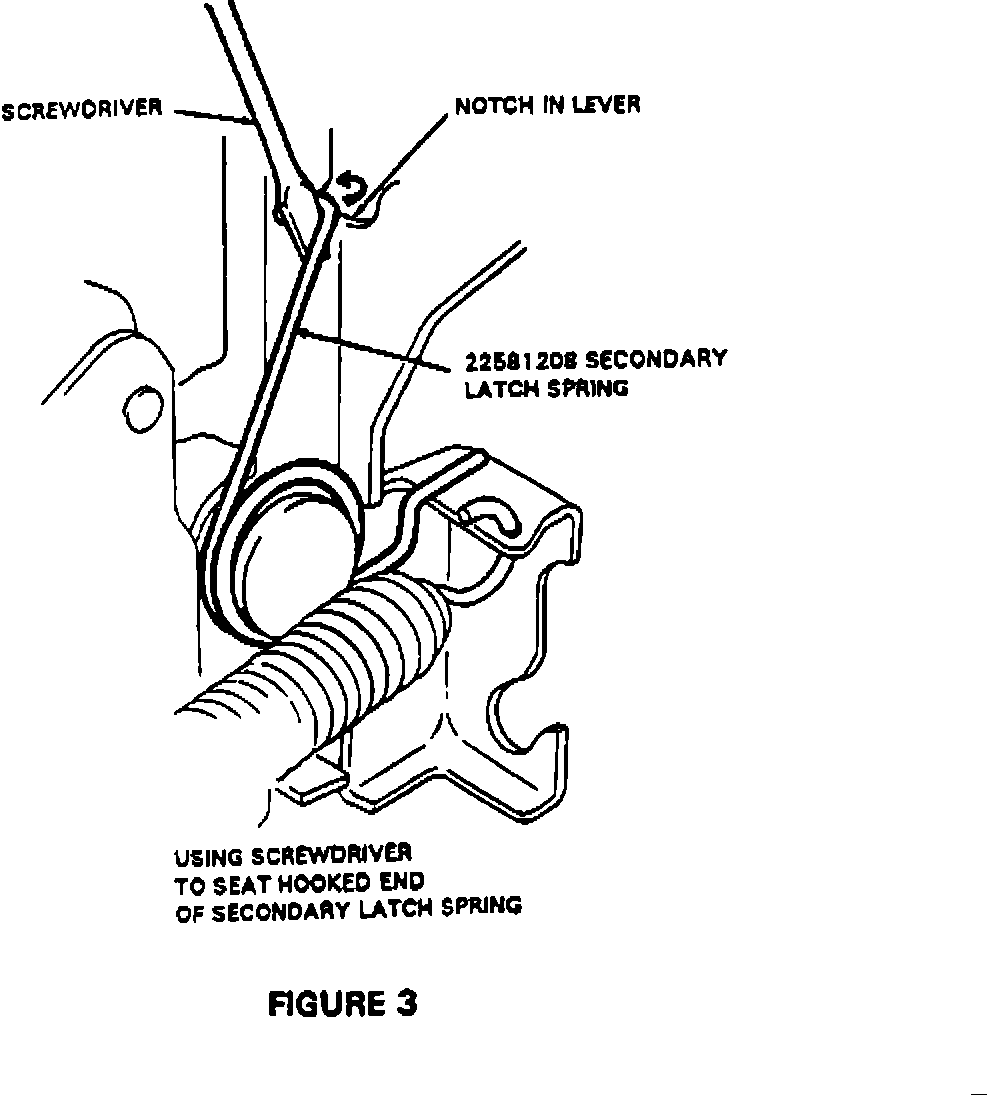 5. Using a small, flat bladed screw driver, place hooked end of spring into position on outboard side of secondary latch. See Figure 3.