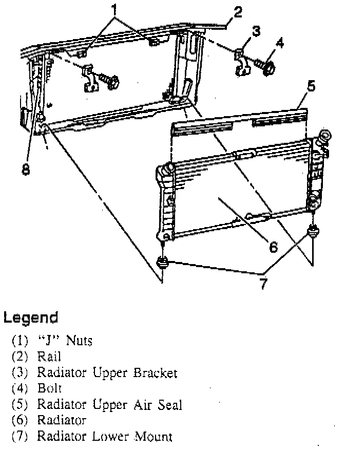 7. Upper radiator mounting panel bolts and clamps.