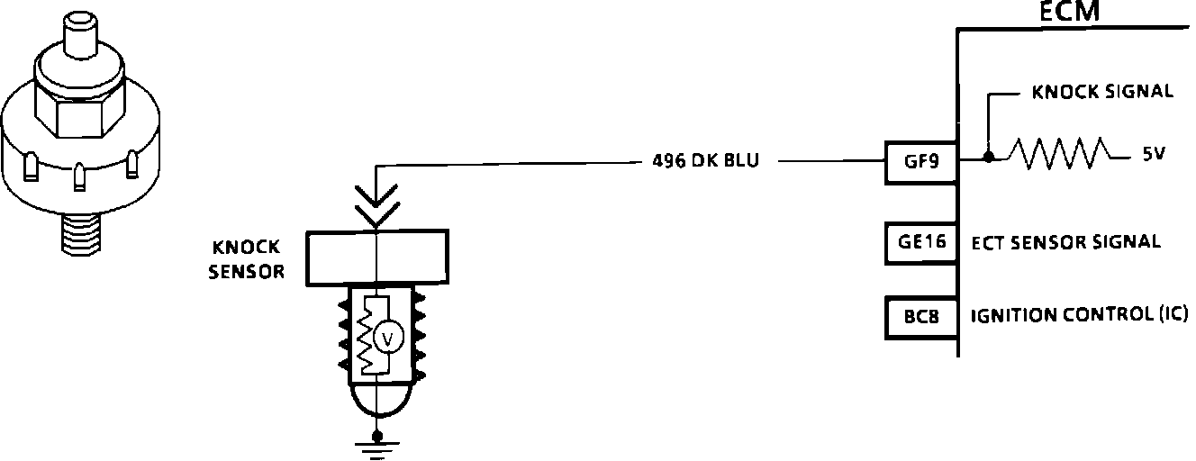The knock Sensor (KS) is used to detect engine detonation and the ECM will retard the ignition control timing based on the signal being received. The circuitry, within the knock sensor, causes the ECMs 5 volts to he pulled down so that under a no knock condition, CKT 496 would measure about 2.5 volts. The knock sensor produces an AC signal, which rides on the 2.5 volts DC voltage. The amplitude and frequency are dependent upon the knock level.