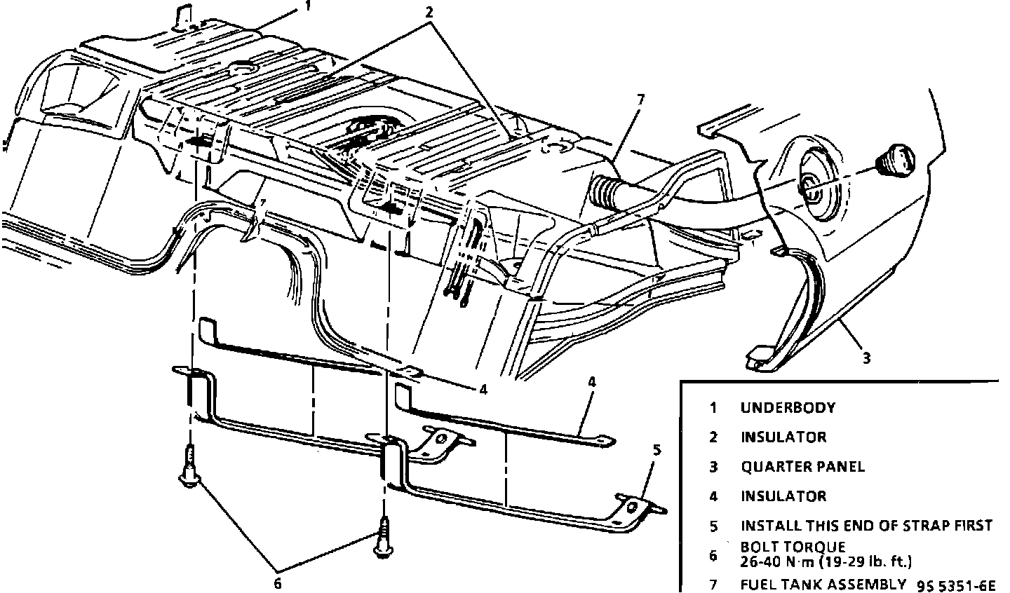 1. Hook rear end of fuel tank straps into underbody bracket