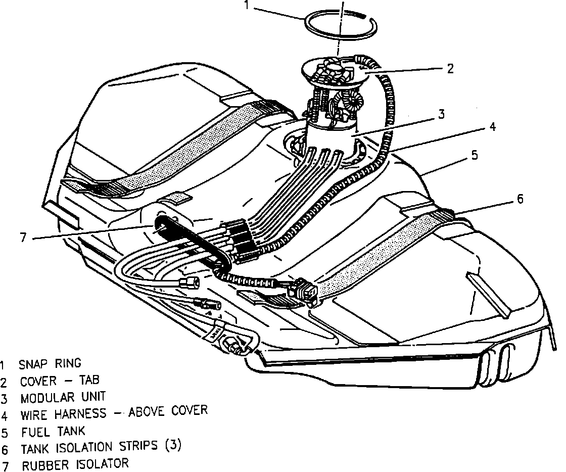 The fuel tank is located under the rear of the vehicle and is the fuel reservoir. The tank has a vertical baffle installed to support the filler tube and to serve as a slosh baffle. The fuel pump and fuel level sending unit assembly are mounted in the fuel tank as one assembly. The fuel tank assembly also consists of the fuel filler neck and filler cap.