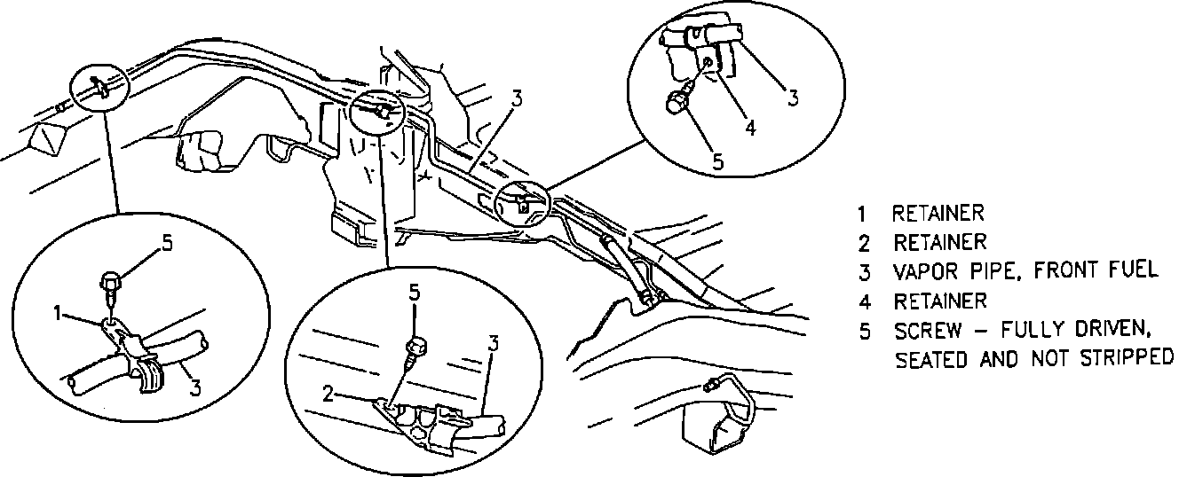 The fuel feed and return pipes extend from the fuel pump/gauge sending unit to the engine compartment. The pipes are secured to the underbody with clip and screw assemblies. Both fuel feed pipes and return pipe must be properly routed and retained, and should be inspected occasionally for leaks, kinks, or dents. If evidence of dirt is found in the fuel rail/injector assembly or fuel filter during disassembly, the pipes should be disconnected and blown out. Check the fuel strainer on the fuel pump/fuel gauge assembly for damage or omission.