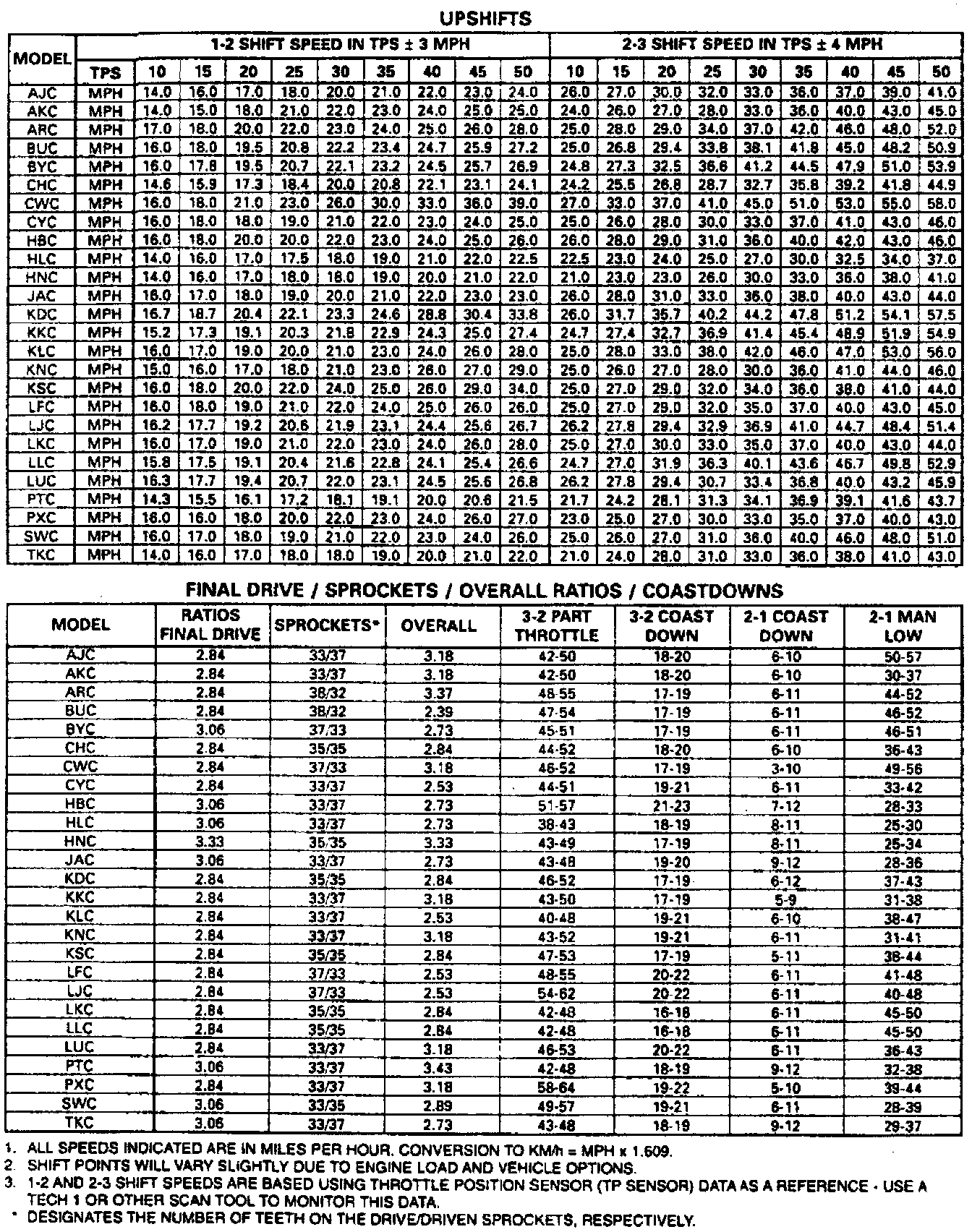 10. With gear selector in Drive, accelerate until vehicle shifts into 3rd gear and TCC is applied.Release accelerator and lightly apply brake. The TCC should release, then note downshift speed points and compare results with speed points shown in the figures.