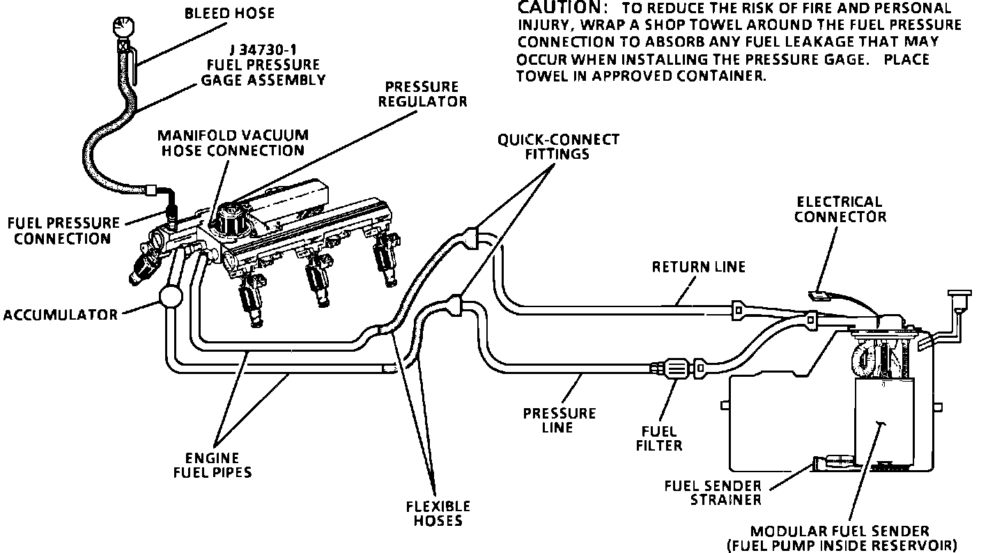 1. Wrap a shop towel around the fuel connector to absorb any small amount of leakage that may occur when installing the gauge. Ignition "ON," engine "OFF," pump pressure should be 284-325 kPa (41-47 psi). This pressure is controlled by spring pressure within the regulator assembly.