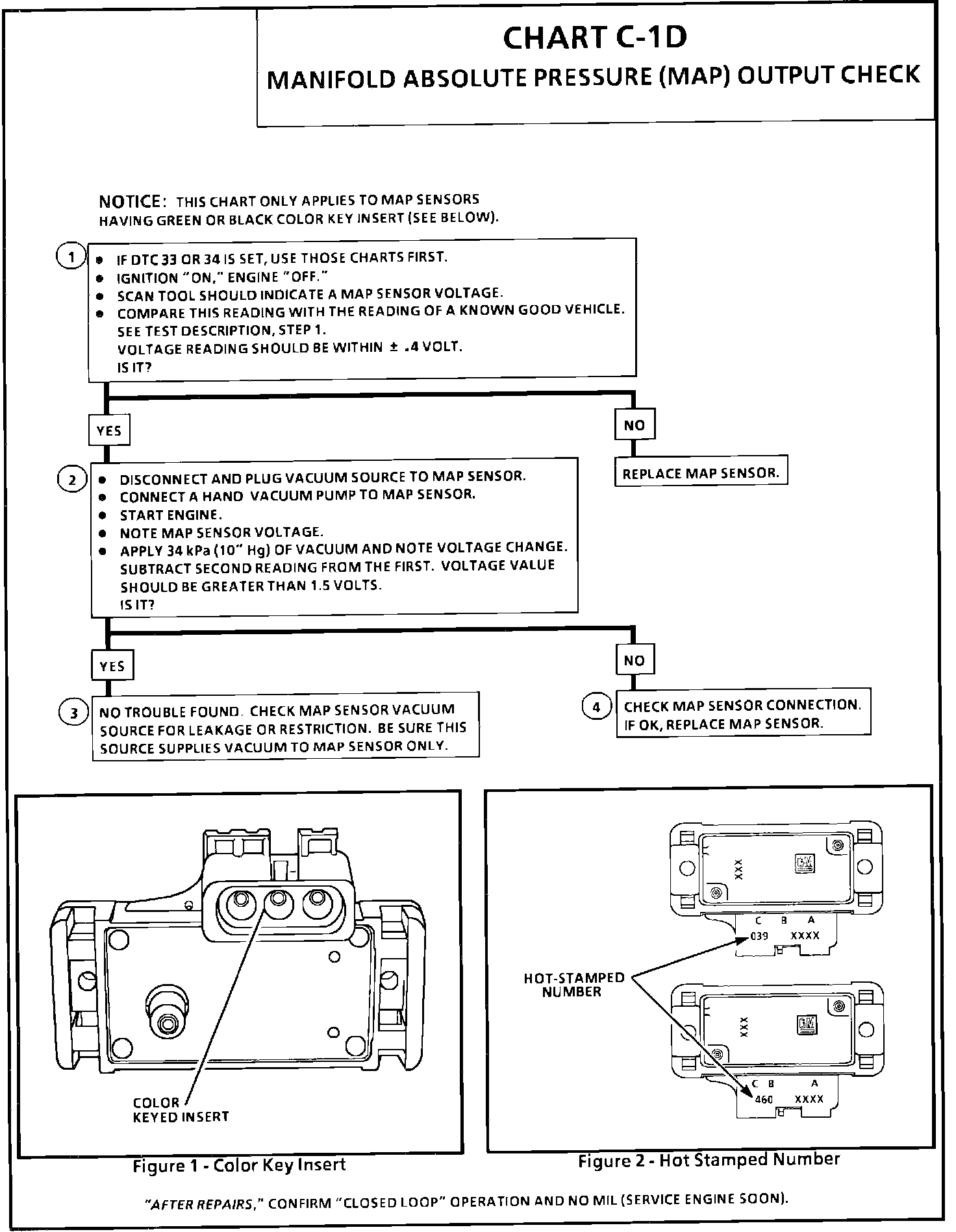 1. When comparing scan tool readings to a known good vehicle, it is important to compare vehicles that use a MAP sensor having the same color insert or having the same "Hot Stamped" number. See figures on chart.
